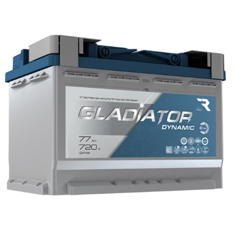 Купите аккумулятор АКБ Gladiator Dynamic L Euro 77 А/ч 720А 276х175х190 п.п. GDY7700. Цена 7399 рублей. Также в каталоге 10 моделей аккумуляторных батарей Gladiator и аккумуляторы других производителей.