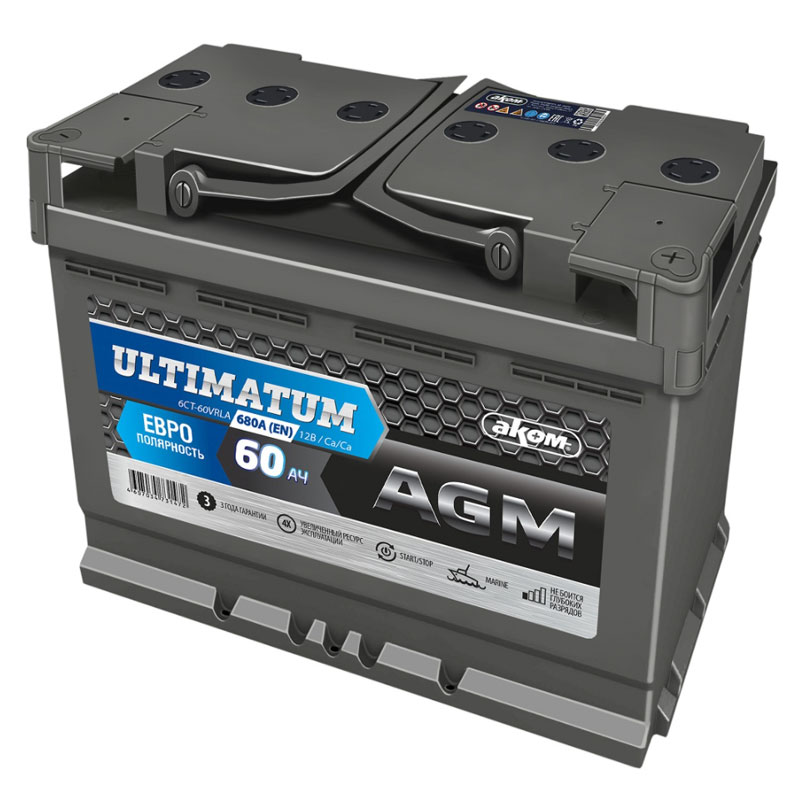 Аккумуляторные батареи ULTIMATUM AGM – это продукция класса Премиум, полностью соответствуют международным стандартам качества и подходят для использования в автомобилях, оснащённых системами «Старт/Стоп» и рекуперативного торможения.