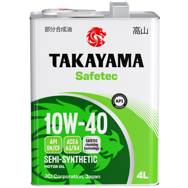 Купите полусинтетическое моторное масло Масло моторное Takayama 10W-40 Safetec ACEA A3/B4 API SN/CF 4л металл 6056037 цена 1999 рублей. В наличии моторные масла 10W-40 от производителей: Bardahl, Castrol, Elf, ENEOS, G-Energy, General Motors, HI-GEAR, Idemitsu, Kixx, LADA, Lavr, LiquiMoly, Lubex, LUXE, Mannol, Micking, Mirax, Mobil, Motul, Mozer, NGN, NISSAN, RAVENOL, RIXX, ROLF, ROWE, Shell, Sintec, Takayama, TOTACHI, Total, UAZ, Unix, Valesco, Well Run, Wezzer, Yamalube, ZIC, Газпромнефть, Лукойл, Роснефть. Также в наличии полусинтетические масла 10W-40, масла для универсальный (бензиновый и дизельныых типов двигателей.