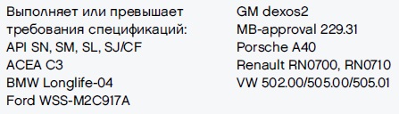 В его разработке приняты во внимание специальные требования новейших усовершенствованных конструкций легковых двигателей, специальные требования устройств дополнительной обработки выхлопных газов, а также новейшие более жесткие требования по качеству новых классов API SN, ACEA C3 и ужесточенные требования классификаций изготовителей автомобилей, такие как BMW LL-04 and MB 229.31.